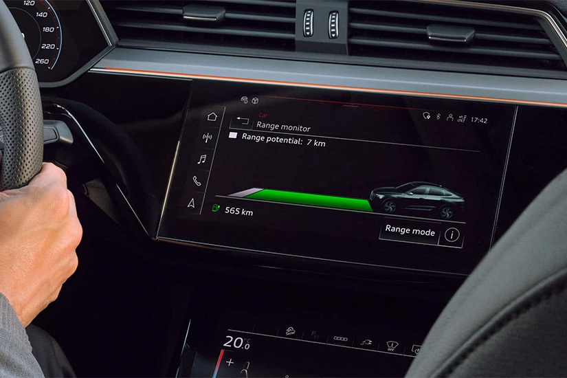 Graças a uma maior capacidade de bateria e de carregamento o Audi Q8 e-tron quattro agora pode percorrer 357 quilômetros com apenas uma carga de bateria (Padrão Inmetro)