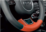 Volante e manoplas em couro, que combinam com as cores do Co...