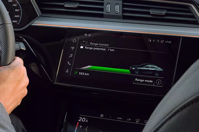 Graças a uma maior capacidade de bateria e de carregamento o Audi Q8 e-tron quattro agora pode percorrer 357 quilômetros com apenas uma carga de bateria (Padrão Inmetro)
