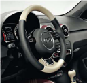 Volante e manoplas em couro, que combinam com as cores do Co...